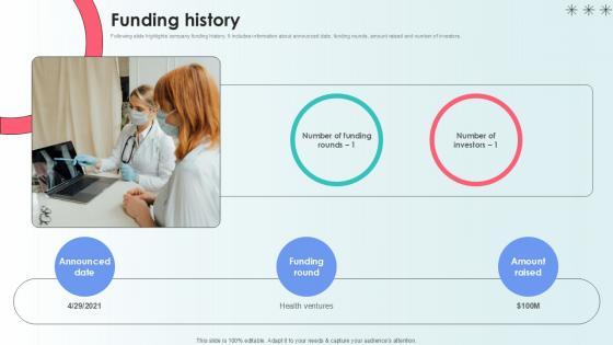 Following slide highlights company funding history. It includes information about announced date, funding rounds, amount raised and number of investors. Slidegeeks is here to make your presentations a breeze with Funding History Capital Raising Pitch Deck For Health Care Services Ppt Template With our easy-to-use and customizable templates, you can focus on delivering your ideas rather than worrying about formatting. With a variety of designs to choose from, you are sure to find one that suits your needs. And with animations and unique photos, illustrations, and fonts, you can make your presentation pop. So whether you are giving a sales pitch or presenting to the board, make sure to check out Slidegeeks first Following slide highlights company funding history. It includes information about announced date, funding rounds, amount raised and number of investors.