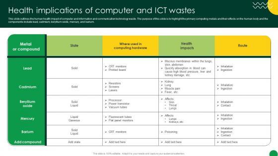 This slide outlines the human health impact of computer and information and communication technology waste. The purpose of this slide is to highlight the primary computing metals and their effects on the human body and the components include lead, cadmium, beryllium oxide, mercury, and barium. Welcome to our selection of the Solar Computing IT Health Implications Of Computer And ICT Wastes. These are designed to help you showcase your creativity and bring your sphere to life. Planning and Innovation are essential for any business that is just starting out. This collection contains the designs that you need for your everyday presentations. All of our PowerPoints are 100Percent editable, so you can customize them to suit your needs. This multi-purpose template can be used in various situations. Grab these presentation templates today. This slide outlines the human health impact of computer and information and communication technology waste. The purpose of this slide is to highlight the primary computing metals and their effects on the human body and the components include lead, cadmium, beryllium oxide, mercury, and barium.