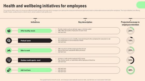 The purpose of this slide is to showcase different health initiatives through which managers can optimize the employee wellness program and create a collaborative environment at the workplace. The major initiatives are offering healthy meals, a potluck lunch, a bike to work, and an outdoor multi-sports court.Do you know about Slidesgeeks Health And Wellbeing Initiatives For Employees Developing Employee Retention Techniques To Minimize Demonstration PDF These are perfect for delivering any kind od presentation. Using it, create PowerPoint presentations that communicate your ideas and engage audiences. Save time and effort by using our pre-designed presentation templates that are perfect for a wide range of topic. Our vast selection of designs covers a range of styles, from creative to business, and are all highly customizable and easy to edit. Download as a PowerPoint template or use them as Google Slides themes.