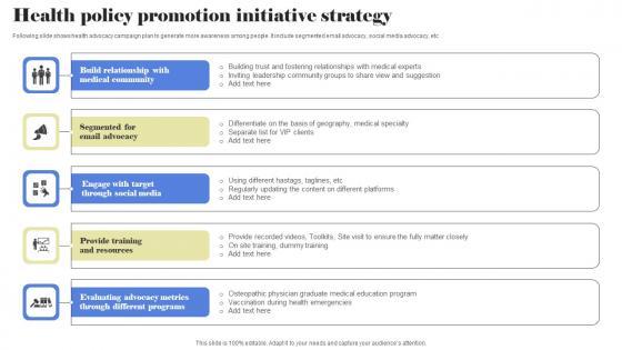 Following slide shows health advocacy campaign plan to generate more awareness among people .It include segmented email advocacy, social media advocacy, etcPitch your topic with ease and precision using this Health Policy Promotion Initiative Strategy Rules Pdf This layout presents information on Medical Community, Provide Training, Through Different Programs It is also available for immediate download and adjustment. So, changes can be made in the color, design, graphics or any other component to create a unique layout. Following slide shows health advocacy campaign plan to generate more awareness among people .It include segmented email advocacy, social media advocacy, etc