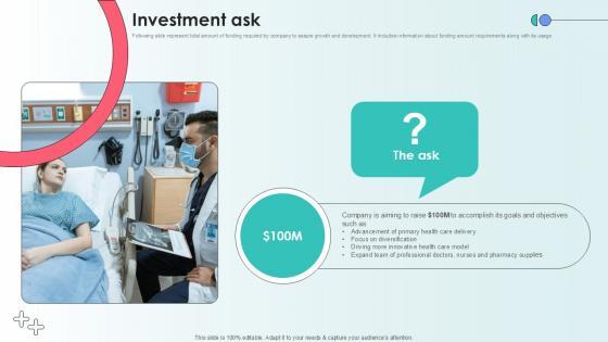 Following slide represent total amount of funding required by company to assure growth and development. It includes information about funding amount requirements along with its usage. Whether you have daily or monthly meetings, a brilliant presentation is necessary. Investment Ask Capital Raising Pitch Deck For Health Care Services Ppt Sample can be your best option for delivering a presentation. Represent everything in detail using Investment Ask Capital Raising Pitch Deck For Health Care Services Ppt Sample and make yourself stand out in meetings. The template is versatile and follows a structure that will cater to your requirements. All the templates prepared by Slidegeeks are easy to download and edit. Our research experts have taken care of the corporate themes as well. So, give it a try and see the results. Following slide represent total amount of funding required by company to assure growth and development. It includes information about funding amount requirements along with its usage.