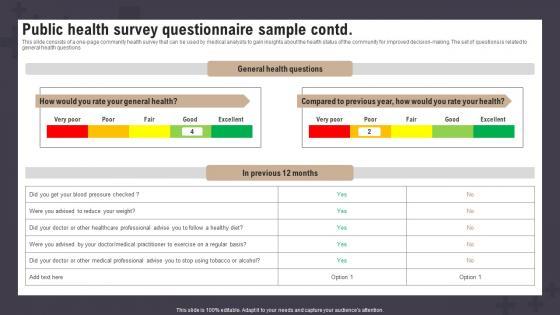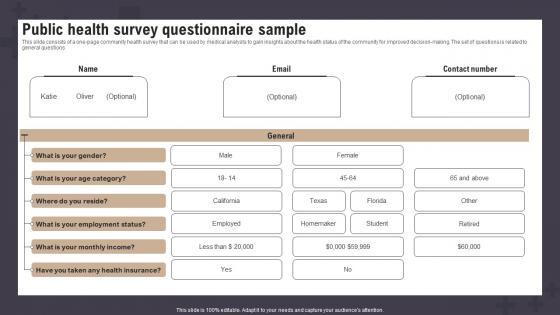 This slide consists of a one-page community health survey that can be used by medical analysts to gain insights about the health status of the community for improved decision-making. The set of questions is related to general questions Showcasing this set of slides titled Public Health Survey Questionnaire Sample Survey Ss The topics addressed in these templates are Age Category, Health Insurance, Public Health All the content presented in this PPT design is completely editable. Download it and make adjustments in color, background, font etc. as per your unique business setting. This slide consists of a one-page community health survey that can be used by medical analysts to gain insights about the health status of the community for improved decision-making. The set of questions is related to general questions