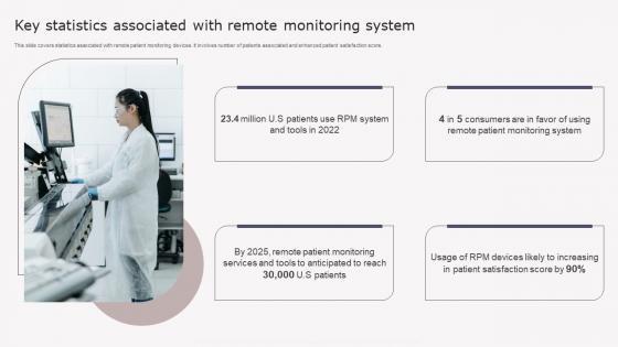 This slide covers statistics associated with remote patient monitoring devices. It involves number of patients associated and enhanced patient satisfaction score. Coming up with a presentation necessitates that the majority of the effort goes into the content and the message you intend to convey. The visuals of a PowerPoint presentation can only be effective if it supplements and supports the story that is being told. Keeping this in mind our experts created Key Statistics Associated Remote Transforming Medicare Services Using Health Topics Pdf to reduce the time that goes into designing the presentation. This way, you can concentrate on the message while our designers take care of providing you with the right template for the situation. This slide covers statistics associated with remote patient monitoring devices. It involves number of patients associated and enhanced patient satisfaction score.