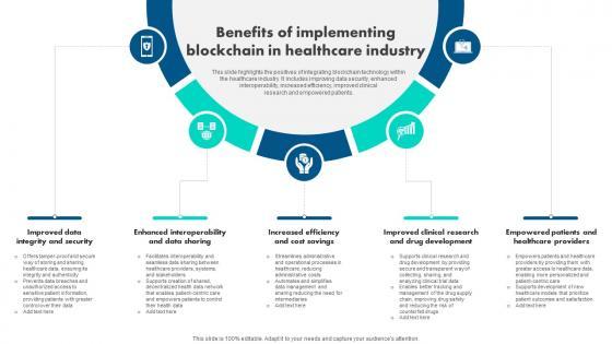 This slide highlights the positives of integrating blockchain technology within the healthcare industry. It includes improving data security, enhanced interoperability, increased efficiency, improved clinical research and empowered patients. Slidegeeks is here to make your presentations a breeze with How Blockchain Is Reshaping Benefits Of Implementing Blockchain In Healthcare BCT SS V With our easy-to-use and customizable templates, you can focus on delivering your ideas rather than worrying about formatting. With a variety of designs to choose from, you are sure to find one that suits your needs. And with animations and unique photos, illustrations, and fonts, you can make your presentation pop. So whether you are giving a sales pitch or presenting to the board, make sure to check out Slidegeeks first This slide highlights the positives of integrating blockchain technology within the healthcare industry. It includes improving data security, enhanced interoperability, increased efficiency, improved clinical research and empowered patients.