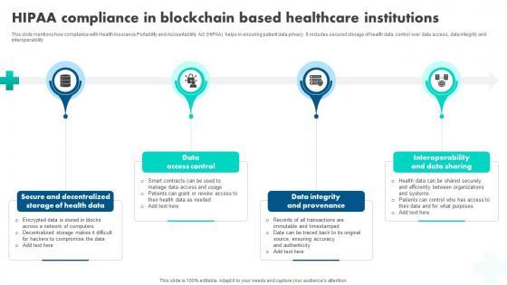 This slide mentions how compliance with Health Insurance Portability and Accountability Act HIPAA helps in ensuring patient data privacy. It includes secured storage of health data, control over data access, data integrity and interoperability. The best PPT templates are a great way to save time, energy, and resources. Slidegeeks have 100 percent editable powerpoint slides making them incredibly versatile. With these quality presentation templates, you can create a captivating and memorable presentation by combining visually appealing slides and effectively communicating your message. Download How Blockchain Is Reshaping HIPAA Compliance In Blockchain Based Healthcare BCT SS V from Slidegeeks and deliver a wonderful presentation. This slide mentions how compliance with Health Insurance Portability and Accountability Act HIPAA helps in ensuring patient data privacy. It includes secured storage of health data, control over data access, data integrity and interoperability.