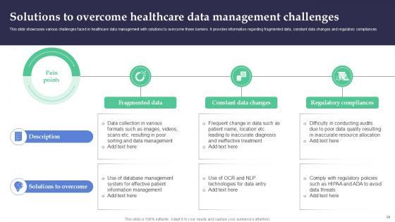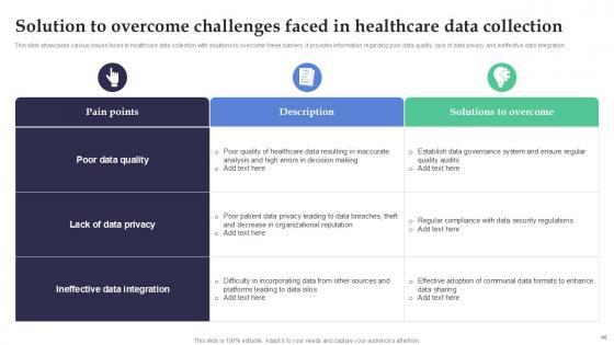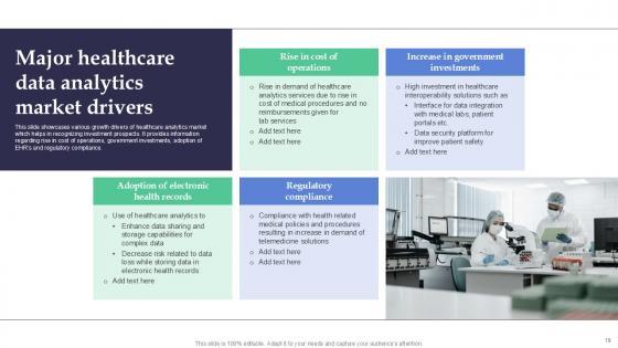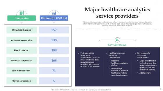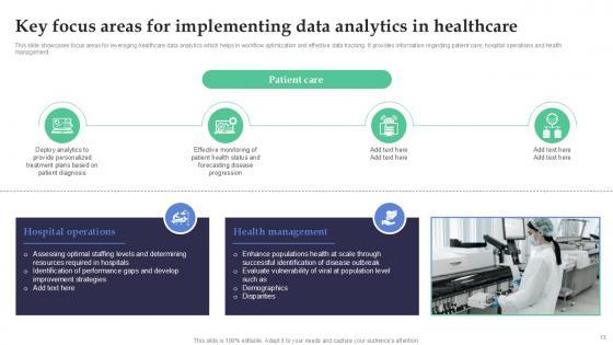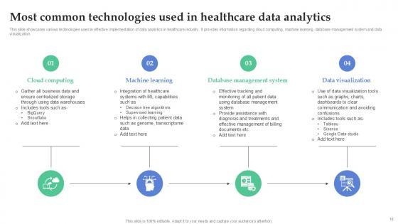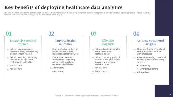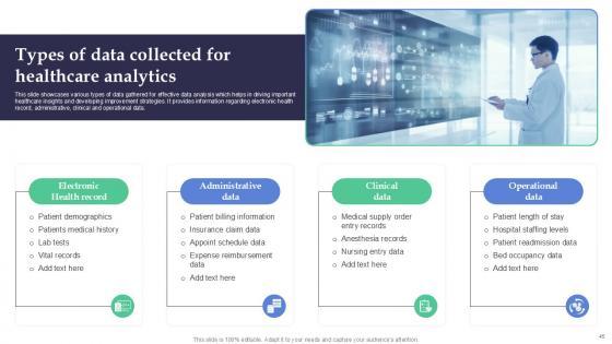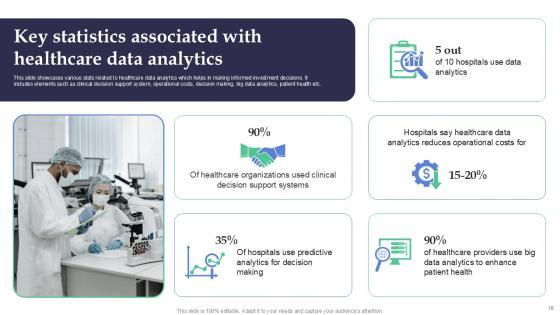 If designing a presentation takes a lot of your time and resources and you are looking for a better alternative, then this Healthcare Data Analytics Ppt PowerPoint Presentation Complete Deck With Slides is the right fit for you. This is a prefabricated set that can help you deliver a great presentation on the topic. All the Seventeen slides included in this sample template can be used to present a birds eye view of the topic. These slides are also fully editable, giving you enough freedom to add specific details to make this layout more suited to your business setting. Apart from the content, all other elements like color, design, theme are also replaceable and editable. This helps in designing a variety of presentations with a single layout. Not only this, you can use this PPT design in formats like PDF, PNG, and JPG once downloaded. Therefore, without any further ado, download and utilize this sample presentation as per your liking.