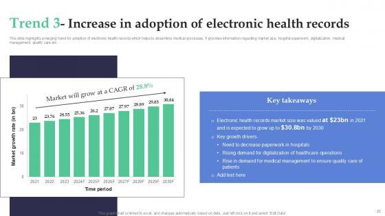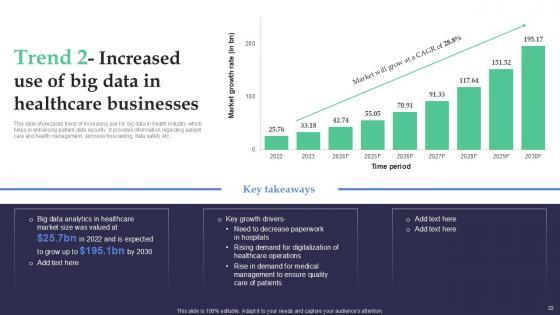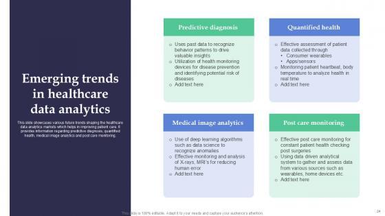 This slide showcases current trends seen of big data analytics for healthcare services. It provides information regarding predictive diagnosis, quantified health and medical image analytics. Are you searching for a Emerging Trends In Healthcare Big Developing Strategic Insights Using Big Data Analytics SS V that is uncluttered, straightforward, and original Its easy to edit, and you can change the colors to suit your personal or business branding. For a presentation that expresses how much effort you have put in, this template is ideal With all of its features, including tables, diagrams, statistics, and lists, its perfect for a business plan presentation. Make your ideas more appealing with these professional slides. Download Emerging Trends In Healthcare Big Developing Strategic Insights Using Big Data Analytics SS V from Slidegeeks today. This slide showcases current trends seen of big data analytics for healthcare services. It provides information regarding predictive diagnosis, quantified health and medical image analytics.