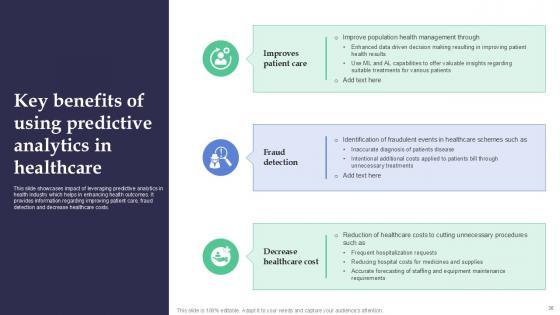 This slide outlines the application of predictive analytics in the healthcare department for forecasting the probability of patients having particular medical disorders. The benefits include improving patient outcomes, relief for healthcare professionals, and improvement in the decision making process. Create an editable Predictive Analytics In The Age Of Big Data Applications Of Predictive Analytics In Healthcare Professional PDF that communicates your idea and engages your audience. Whether youre presenting a business or an educational presentation, pre designed presentation templates help save time. Predictive Analytics In The Age Of Big Data Applications Of Predictive Analytics In Healthcare Professional PDF is highly customizable and very easy to edit, covering many different styles from creative to business presentations. Slidegeeks has creative team members who have crafted amazing templates. So, go and get them without any delay.