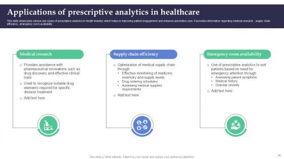 This slide outlines various areas where prescriptive analytics may be implemented to improve the working of healthcare sector. It covers areas such as treatment plan optimization, resource allocation, medication adherence, operation room scheduling, etc.Slidegeeks is here to make your presentations a breeze with Applications Of Prescriptive Analytics In Healthcare Sector Data Analytics SS V With our easy-to-use and customizable templates, you can focus on delivering your ideas rather than worrying about formatting. With a variety of designs to choose from, you are sure to find one that suits your needs. And with animations and unique photos, illustrations, and fonts, you can make your presentation pop. So whether you are giving a sales pitch or presenting to the board, make sure to check out Slidegeeks first This slide outlines various areas where prescriptive analytics may be implemented to improve the working of healthcare sector. It covers areas such as treatment plan optimization, resource allocation, medication adherence, operation room scheduling, etc.