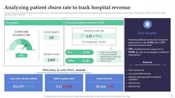 This slide shows the healthcare dashboard that presents analytical data such as occupancy, patient turnover, efficiency and costs, satisfaction and service indicators. Deliver and pitch your topic in the best possible manner with this iot and digital twin to reduce costs post covid healthcare dashboard showing analytical data elements pdf. Use them to share invaluable insights on occupancy, patient turnover, efficiency and costs, satisfaction and service indicators and impress your audience. This template can be altered and modified as per your expectations. So, grab it now.