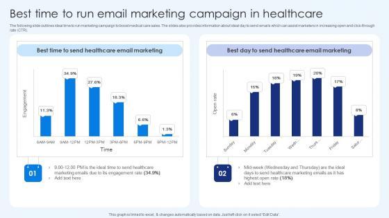 The following slide outlines ideal time to run marketing campaign to boost medical care sales. The slides also provides information about ideal day to send emails which can assist marketers in increasing open and click-through rate CTR. Explore a selection of the finest Best Time To Run Email Marketing Campaign In Healthcare Ideas PDF here. With a plethora of professionally designed and pre-made slide templates, you can quickly and easily find the right one for your upcoming presentation. You can use our Best Time To Run Email Marketing Campaign In Healthcare Ideas PDF to effectively convey your message to a wider audience. Slidegeeks has done a lot of research before preparing these presentation templates. The content can be personalized and the slides are highly editable. Grab templates today from Slidegeeks.