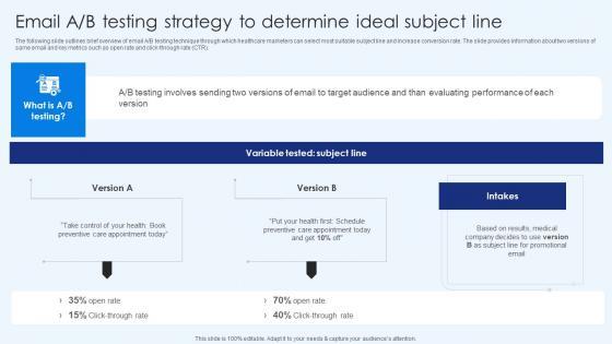 The following slide outlines brief overview of email A B testing technique through which healthcare marketers can select most suitable subject line and increase conversion rate. The slide provides information about two versions of same email and key metrics such as open rate and click-through rate CTR. Slidegeeks is here to make your presentations a breeze with Email A B Testing Strategy To Determine Ideal Healthcare Promotion Portrait Pdf With our easy-to-use and customizable templates, you can focus on delivering your ideas rather than worrying about formatting. With a variety of designs to choose from, you are sure to find one that suits your needs. And with animations and unique photos, illustrations, and fonts, you can make your presentation pop. So whether you are giving a sales pitch or presenting to the board, make sure to check out Slidegeeks first The following slide outlines brief overview of email A B testing technique through which healthcare marketers can select most suitable subject line and increase conversion rate. The slide provides information about two versions of same email and key metrics such as open rate and click-through rate CTR.