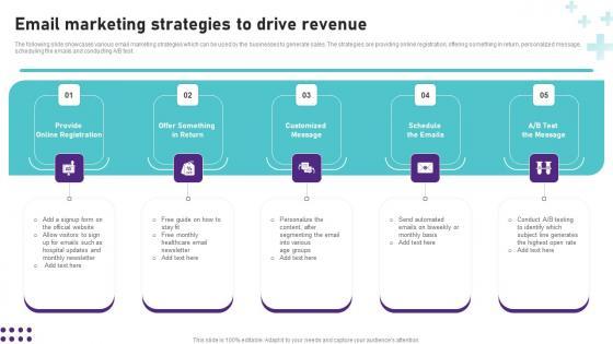 The following slide showcases various email marketing strategies which can be used by the businesses to generate sales. The strategies are providing online registration, offering something in return, personalized message, scheduling the emails and conducting A B test. This modern and well arranged Guide To Healthcare Services Administration Email Marketing Strategies To Drive Revenue Sample PDF provides lots of creative possibilities. It is very simple to customize and edit with the Powerpoint Software. Just drag and drop your pictures into the shapes. All facets of this template can be edited with Powerpoint no extra software is necessary. Add your own material, put your images in the places assigned for them, adjust the colors, and then you can show your slides to the world, with an animated slide included.