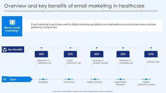 The following slide outlines introduction to email marketing in medical care. The slide provides information about major advantages of using emails in healthcare such as decreased marketing cost, higher transaction cost, etc. This Overview And Key Benefits Of Email Marketing In Healthcare Portrait PDF is perfect for any presentation, be it in front of clients or colleagues. It is a versatile and stylish solution for organizing your meetings. The Overview And Key Benefits Of Email Marketing In Healthcare Portrait PDF features a modern design for your presentation meetings. The adjustable and customizable slides provide unlimited possibilities for acing up your presentation. Slidegeeks has done all the homework before launching the product for you. So, do not wait, grab the presentation templates today