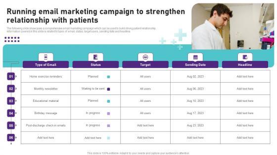 The following slide showcases a comprehensive email marketing campaign which can be used to build strong patient relationship. Information covered in this slide is related to types of email, status, target users, sending date and headline. There are so many reasons you need a Guide To Healthcare Services Administration Running Email Marketing Campaign To Strengthen Relationship Rules PDF. The first reason is you cannot spend time making everything from scratch, Thus, Slidegeeks has made presentation templates for you too. You can easily download these templates from our website easily.