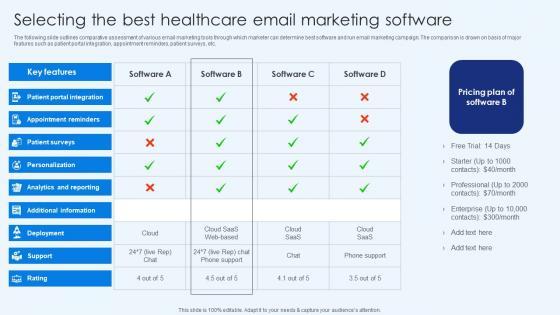 The following slide outlines comparative assessment of various email marketing tools through which marketer can determine best software and run email marketing campaign. The comparison is drawn on basis of major features such as patient portal integration, appointment reminders, patient surveys, etc. If your project calls for a presentation, then Slidegeeks is your go-to partner because we have professionally designed, easy-to-edit templates that are perfect for any presentation. After downloading, you can easily edit Selecting The Best Healthcare Email Marketing Software Healthcare Promotion Designs Pdf and make the changes accordingly. You can rearrange slides or fill them with different images. Check out all the handy templates The following slide outlines comparative assessment of various email marketing tools through which marketer can determine best software and run email marketing campaign. The comparison is drawn on basis of major features such as patient portal integration, appointment reminders, patient surveys, etc.