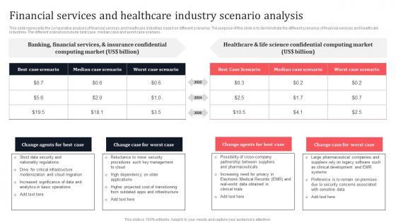 This slide represents the comparative analysis of financial services and healthcare industries based on different scenarios. The purpose of this slide is to demonstrate the different scenarios of financial services and healthcare industries. The different scenarios include best case, median case and worst case scenario. The Financial Services And Healthcare Industry Scenario Analysis Secure Multi Party Sample Pdf is a compilation of the most recent design trends as a series of slides. It is suitable for any subject or industry presentation, containing attractive visuals and photo spots for businesses to clearly express their messages. This template contains a variety of slides for the user to input data, such as structures to contrast two elements, bullet points, and slides for written information. Slidegeeks is prepared to create an impression. This slide represents the comparative analysis of financial services and healthcare industries based on different scenarios. The purpose of this slide is to demonstrate the different scenarios of financial services and healthcare industries. The different scenarios include best case, median case and worst case scenario.