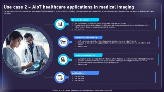 The purpose of this slide is to showcase applications of Artificial Intelligence of Things AIoT in radiology. It provides detailed information about remote diagnosis, customized treatment, and real-time monitoring along with examples. The Use Case 2 AIOT Healthcare Applications In Medical Imaging AIOT Applications For Various Industries IoT SS V is a compilation of the most recent design trends as a series of slides. It is suitable for any subject or industry presentation, containing attractive visuals and photo spots for businesses to clearly express their messages. This template contains a variety of slides for the user to input data, such as structures to contrast two elements, bullet points, and slides for written information. Slidegeeks is prepared to create an impression. The purpose of this slide is to showcase applications of Artificial Intelligence of Things AIoT in radiology. It provides detailed information about remote diagnosis, customized treatment, and real-time monitoring along with examples.