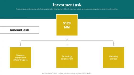 This slide shows information regarding the investment asked by the company from investors. It also includes details about the usage of funds which will be raised from this investment round. Are you searching for a Digital Healthcare Platform Fundraising Pitch Deck Investment Ask Ideas PDF that is uncluttered, straightforward, and original Its easy to edit, and you can change the colors to suit your personal or business branding. For a presentation that expresses how much effort you have put in, this template is ideal. With all of its features, including tables, diagrams, statistics, and lists, its perfect for a business plan presentation. Make your ideas more appealing with these professional slides. Download Digital Healthcare Platform Fundraising Pitch Deck Investment Ask Ideas PDF from Slidegeeks today.