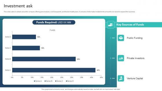 This slide caters to details about the company offering personalized, cost transparent, and flexible health plans. It consists of information related to the amount to be raised to expand the business. Boost your pitch with our creative Investment Ask Healthcare Insurance App Capital Raising Pitch Deck Graphics Pdf. Deliver an awe inspiring pitch that will mesmerize everyone. Using these presentation templates you will surely catch everyones attention. You can browse the ppts collection on our website. We have researchers who are experts at creating the right content for the templates. So you do not have to invest time in any additional work. Just grab the template now and use them. This slide caters to details about the company offering personalized, cost transparent, and flexible health plans. It consists of information related to the amount to be raised to expand the business.