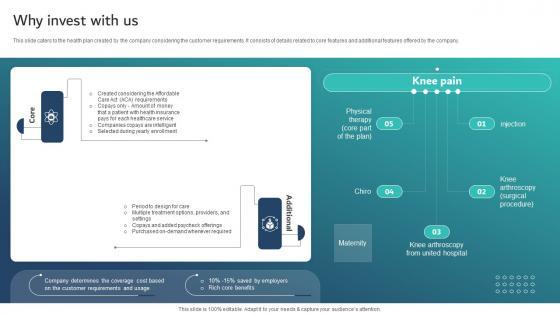 This slide caters to the health plan created by the company considering the customer requirements. It consists of details related to core features and additional features offered by the company. Are you in need of a template that can accommodate all of your creative concepts This one is crafted professionally and can be altered to fit any style. Use it with Google Slides or PowerPoint. Include striking photographs, symbols, depictions, and other visuals. Fill, move around, or remove text boxes as desired. Test out color palettes and font mixtures. Edit and save your work, or work with colleagues. Download Why Invest With Us Healthcare Insurance App Capital Raising Pitch Deck Structure Pdf and observe how to make your presentation outstanding. Give an impeccable presentation to your group and make your presentation unforgettable. This slide caters to the health plan created by the company considering the customer requirements. It consists of details related to core features and additional features offered by the company.