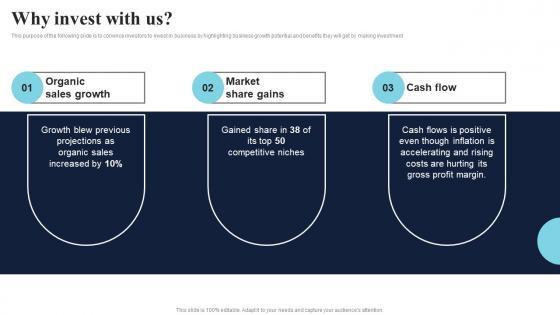 This purpose of the following slide is to convince investors to invest in business by highlighting business growth potential and benefits they will get by making investment. If your project calls for a presentation, then Slidegeeks is your go-to partner because we have professionally designed, easy-to-edit templates that are perfect for any presentation. After downloading, you can easily edit Why Invest With Us Healthcare Product Company Fund Raising Pitch Deck Clipart Pdf and make the changes accordingly. You can rearrange slides or fill them with different images. Check out all the handy templates This purpose of the following slide is to convince investors to invest in business by highlighting business growth potential and benefits they will get by making investment.