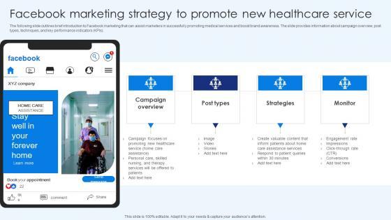 The following slide outlines brief introduction to Facebook marketing that can assist marketers in successfully promoting medical services and boost brand awareness. The slide provides information about campaign overview, post types, techniques, and key performance indicators KPIs. This Facebook Marketing Strategy To Promote New Healthcare Service Sample PDF from Slidegeeks makes it easy to present information on your topic with precision. It provides customization options, so you can make changes to the colors, design, graphics, or any other component to create a unique layout. It is also available for immediate download, so you can begin using it right away. Slidegeeks has done good research to ensure that you have everything you need to make your presentation stand out. Make a name out there for a brilliant performance.