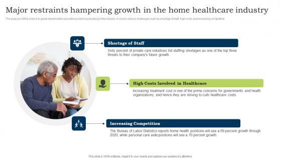 The purpose of this slide is to guide stakeholders about the problems prevailing in the industry. It covers various challenges such as shortage of staff, high costs and increasing competition This Go To Market Strategy Major Restraints Hampering Growth In The Home Healthcare Formats Pdf is perfect for any presentation, be it in front of clients or colleagues. It is a versatile and stylish solution for organizing your meetings. The Go To Market Strategy Major Restraints Hampering Growth In The Home Healthcare Formats Pdf features a modern design for your presentation meetings. The adjustable and customizable slides provide unlimited possibilities for acing up your presentation. Slidegeeks has done all the homework before launching the product for you. So, do not wait, grab the presentation templates today The purpose of this slide is to guide stakeholders about the problems prevailing in the industry. It covers various challenges such as shortage of staff, high costs and increasing competition