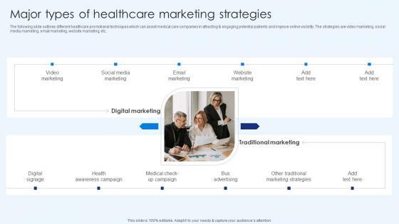The following slide outlines different healthcare promotional techniques which can assist medical care companies in attracting and engaging potential patients and improve online visibility. The strategies are video marketing, social media marketing, email marketing, website marketing, etc. Are you in need of a template that can accommodate all of your creative concepts This one is crafted professionally and can be altered to fit any style. Use it with Google Slides or PowerPoint. Include striking photographs, symbols, depictions, and other visuals. Fill, move around, or remove text boxes as desired. Test out color palettes and font mixtures. Edit and save your work, or work with colleagues. Download Major Types Of Healthcare Marketing Strategies Information PDF and observe how to make your presentation outstanding. Give an impeccable presentation to your group and make your presentation unforgettable.