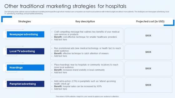 The following slide outlines various traditional marketing techniques through which medical care companies can reach local audience with limited budget and attract more patients. The strategies are newspaper advertising, local TV advertising, hoardings, and pamphlet advertising. Boost your pitch with our creative Other Traditional Marketing Strategies For Hospitals Healthcare Promotion Inspiration Pdf. Deliver an awe-inspiring pitch that will mesmerize everyone. Using these presentation templates you will surely catch everyones attention. You can browse the ppts collection on our website. We have researchers who are experts at creating the right content for the templates. So you do not have to invest time in any additional work. Just grab the template now and use them. The following slide outlines various traditional marketing techniques through which medical care companies can reach local audience with limited budget and attract more patients. The strategies are newspaper advertising, local TV advertising, hoardings, and pamphlet advertising.