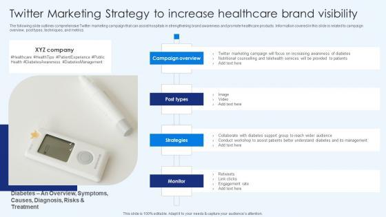 The following slide outlines comprehensive Twitter marketing campaign that can assist hospitals in strengthening brand awareness and promote healthcare products. Information covered in this slide is related to campaign overview, post types, techniques, and metrics. Do you have to make sure that everyone on your team knows about any specific topic I yes, then you should give Twitter Marketing Strategy To Increase Healthcare Brand Visibility Topics PDF a try. Our experts have put a lot of knowledge and effort into creating this impeccable Twitter Marketing Strategy To Increase Healthcare Brand Visibility Topics PDF. You can use this template for your upcoming presentations, as the slides are perfect to represent even the tiniest detail. You can download these templates from the Slidegeeks website and these are easy to edit. So grab these today