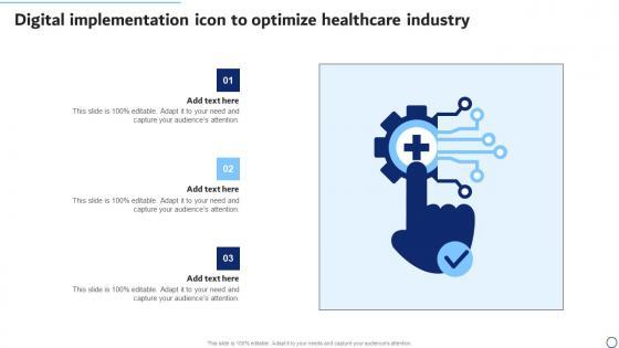 Showcasing this set of slides titled Digital Implementation Icon To Optimize Healthcare Industry Background Pdf. The topics addressed in these templates are Digital Implementation, Optimize Healthcare Industry. All the content presented in this PPT design is completely editable. Download it and make adjustments in color, background, font etc. as per your unique business setting. Our Digital Implementation Icon To Optimize Healthcare Industry Background Pdf are topically designed to provide an attractive backdrop to any subject. Use them to look like a presentation pro.