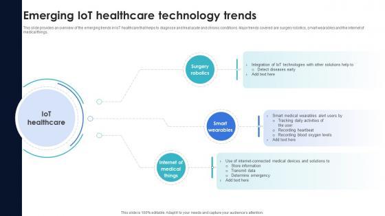 This slide provides an overview of the emerging trends in IoT healthcare that helps to diagnose and treat acute and chronic conditions. Major trends covered are surgery robotics, smart wearables and the internet of medical things. Explore a selection of the finest Optimization Of IoT Remote Monitoring Emerging IoT Healthcare Technology Trends IoT SS V here. With a plethora of professionally designed and pre-made slide templates, you can quickly and easily find the right one for your upcoming presentation. You can use our Optimization Of IoT Remote Monitoring Emerging IoT Healthcare Technology Trends IoT SS V to effectively convey your message to a wider audience. Slidegeeks has done a lot of research before preparing these presentation templates. The content can be personalized and the slides are highly editable. Grab templates today from Slidegeeks. This slide provides an overview of the emerging trends in IoT healthcare that helps to diagnose and treat acute and chronic conditions. Major trends covered are surgery robotics, smart wearables and the internet of medical things.