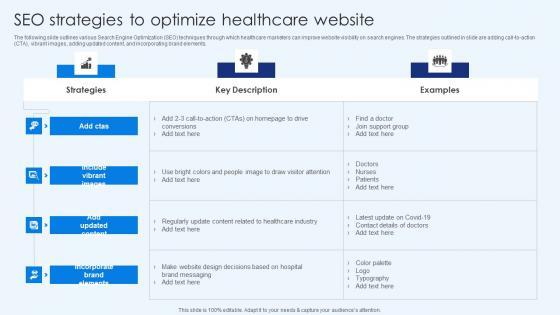 The following slide outlines various Search Engine Optimization SEO techniques through which healthcare marketers can improve website visibility on search engines. The strategies outlined in slide are adding call-to-action CTA, vibrant images, adding updated content, and incorporating brand elements. Create an editable SEO Strategies To Optimize Healthcare Website Healthcare Promotion Brochure Pdf that communicates your idea and engages your audience. Whether you are presenting a business or an educational presentation, pre-designed presentation templates help save time. SEO Strategies To Optimize Healthcare Website Healthcare Promotion Brochure Pdf is highly customizable and very easy to edit, covering many different styles from creative to business presentations. Slidegeeks has creative team members who have crafted amazing templates. So, go and get them without any delay. The following slide outlines various Search Engine Optimization SEO techniques through which healthcare marketers can improve website visibility on search engines. The strategies outlined in slide are adding call-to-action CTA, vibrant images, adding updated content, and incorporating brand elements.