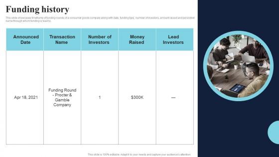 This slide showcases timeframe of funding rounds of a consumer goods company along with date, funding type, number of investors, amount raised and personnel name through whom funding is lead by. Find a pre-designed and impeccable Funding History Healthcare Product Company Fund Raising Pitch Deck Topics Pdf. The templates can ace your presentation without additional effort. You can download these easy-to-edit presentation templates to make your presentation stand out from others. So, what are you waiting for Download the template from Slidegeeks today and give a unique touch to your presentation. This slide showcases timeframe of funding rounds of a consumer goods company along with date, funding type, number of investors, amount raised and personnel name through whom funding is lead by.