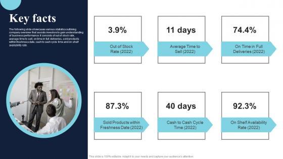 The following slide showcases various statistics outlining company overview that assists investors to gain understanding of business performance. It consists of out of stock rate, average time to sell, on time in full deliveries, sold products within freshness date, cash to cash cycle time and on shelf availability rate. Slidegeeks is one of the best resources for PowerPoint templates. You can download easily and regulate Key Facts Healthcare Product Company Fund Raising Pitch Deck Elements Pdf for your personal presentations from our wonderful collection. A few clicks is all it takes to discover and get the most relevant and appropriate templates. Use our Templates to add a unique zing and appeal to your presentation and meetings. All the slides are easy to edit and you can use them even for advertisement purposes. The following slide showcases various statistics outlining company overview that assists investors to gain understanding of business performance. It consists of out of stock rate, average time to sell, on time in full deliveries, sold products within freshness date, cash to cash cycle time and on shelf availability rate.