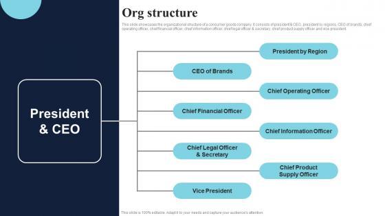 This slide showcases the organizational structure of a consumer goods company. It consists of president and CEO, president by regions, CEO of brands, chief operating officer, chief financial officer, chief information officer, chief legal officer and secretary, chief product supply officer and vice president. Do you have to make sure that everyone on your team knows about any specific topic I yes, then you should give Org Structure Healthcare Product Company Fund Raising Pitch Deck Rules Pdf a try. Our experts have put a lot of knowledge and effort into creating this impeccable Org Structure Healthcare Product Company Fund Raising Pitch Deck Rules Pdf. You can use this template for your upcoming presentations, as the slides are perfect to represent even the tiniest detail. You can download these templates from the Slidegeeks website and these are easy to edit. So grab these today This slide showcases the organizational structure of a consumer goods company. It consists of president and CEO, president by regions, CEO of brands, chief operating officer, chief financial officer, chief information officer, chief legal officer and secretary, chief product supply officer and vice president.