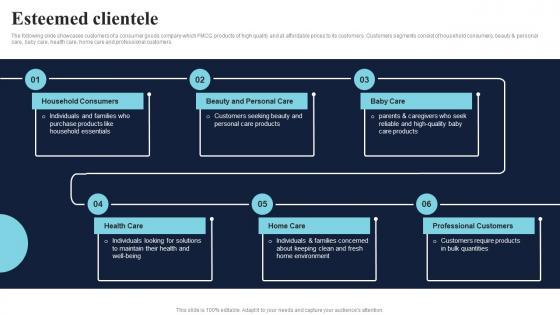 The following slide showcases customers of a consumer goods company which FMCG products of high quality and at affordable prices to its customers. Customers segments consist of household consumers, beauty and personal care, baby care, health care, home care and professional customers. Here you can discover an assortment of the finest PowerPoint and Google Slides templates. With these templates, you can create presentations for a variety of purposes while simultaneously providing your audience with an eye-catching visual experience. Download Esteemed Clientele Healthcare Product Company Fund Raising Pitch Deck Pictures Pdf to deliver an impeccable presentation. These templates will make your job of preparing presentations much quicker, yet still, maintain a high level of quality. Slidegeeks has experienced researchers who prepare these templates and write high-quality content for you. Later on, you can personalize the content by editing the Esteemed Clientele Healthcare Product Company Fund Raising Pitch Deck Pictures Pdf. The following slide showcases customers of a consumer goods company which FMCG products of high quality and at affordable prices to its customers. Customers segments consist of household consumers, beauty and personal care, baby care, health care, home care and professional customers.
