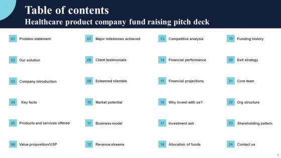 Whether you have daily or monthly meetings, a brilliant presentation is necessary. Table Of Contents Healthcare Product Company Fund Raising Pitch Deck Guidelines Pdf can be your best option for delivering a presentation. Represent everything in detail using Table Of Contents Healthcare Product Company Fund Raising Pitch Deck Guidelines Pdf and make yourself stand out in meetings. The template is versatile and follows a structure that will cater to your requirements. All the templates prepared by Slidegeeks are easy to download and edit. Our research experts have taken care of the corporate themes as well. So, give it a try and see the results. Our Table Of Contents Healthcare Product Company Fund Raising Pitch Deck Guidelines Pdf are topically designed to provide an attractive backdrop to any subject. Use them to look like a presentation pro.