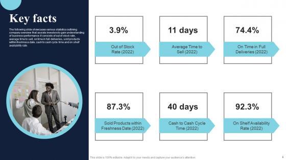 The following slide showcases various statistics outlining company overview that assists investors to gain understanding of business performance. It consists of out of stock rate, average time to sell, on time in full deliveries, sold products within freshness date, cash to cash cycle time and on shelf availability rate. Slidegeeks is one of the best resources for PowerPoint templates. You can download easily and regulate Key Facts Healthcare Product Company Fund Raising Pitch Deck Elements Pdf for your personal presentations from our wonderful collection. A few clicks is all it takes to discover and get the most relevant and appropriate templates. Use our Templates to add a unique zing and appeal to your presentation and meetings. All the slides are easy to edit and you can use them even for advertisement purposes. The following slide showcases various statistics outlining company overview that assists investors to gain understanding of business performance. It consists of out of stock rate, average time to sell, on time in full deliveries, sold products within freshness date, cash to cash cycle time and on shelf availability rate.