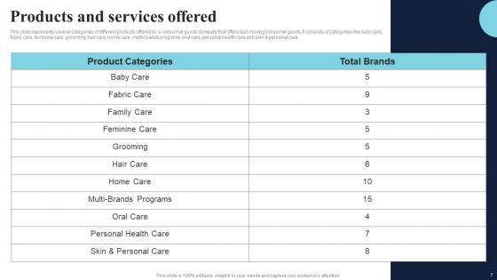 This slide represents several categories of different products offered by a consumer goods company that offers fast-moving consumer goods. It consists of categories like baby care, fabric care, feminine care, grooming, hair care, home care, multi-brands programs, oral care, personal health care and skin and personal care. Present like a pro with Products And Services Offered Healthcare Product Company Fund Raising Pitch Deck Diagrams Pdf Create beautiful presentations together with your team, using our easy-to-use presentation slides. Share your ideas in real-time and make changes on the fly by downloading our templates. So whether you are in the office, on the go, or in a remote location, you can stay in sync with your team and present your ideas with confidence. With Slidegeeks presentation got a whole lot easier. Grab these presentations today. This slide represents several categories of different products offered by a consumer goods company that offers fast-moving consumer goods. It consists of categories like baby care, fabric care, feminine care, grooming, hair care, home care, multi-brands programs, oral care, personal health care and skin and personal care.