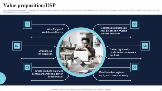 This slide showcases unique selling propositions of products and services offered by a consumer goods company that differentiates its products from others. Differentiators are wide product portfolio, continuous innovation, customer-centric approach, commitment o quality, etc. Find highly impressive Value Proposition Usp Healthcare Product Company Fund Raising Pitch Deck Background Pdf on Slidegeeks to deliver a meaningful presentation. You can save an ample amount of time using these presentation templates. No need to worry to prepare everything from scratch because Slidegeeks experts have already done a huge research and work for you. You need to download Value Proposition Usp Healthcare Product Company Fund Raising Pitch Deck Background Pdf for your upcoming presentation. All the presentation templates are 100 percent editable and you can change the color and personalize the content accordingly. Download now This slide showcases unique selling propositions of products and services offered by a consumer goods company that differentiates its products from others. Differentiators are wide product portfolio, continuous innovation, customer-centric approach, commitment o quality, etc.