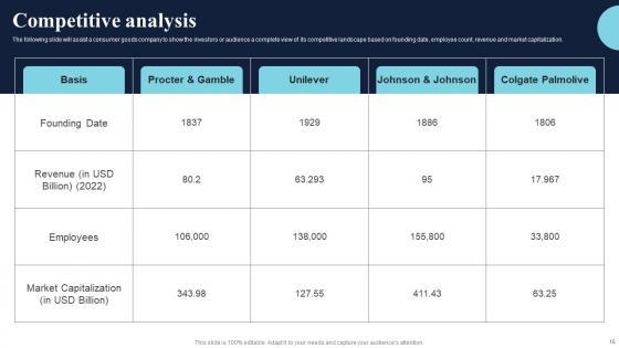 The following slide will assist a consumer goods company to show the investors or audience a complete view of its competitive landscape based on founding date, employee count, revenue and market capitalization. Slidegeeks has constructed Competitive Analysis Healthcare Product Company Fund Raising Pitch Deck Portrait Pdf after conducting extensive research and examination. These presentation templates are constantly being generated and modified based on user preferences and critiques from editors. Here, you will find the most attractive templates for a range of purposes while taking into account ratings and remarks from users regarding the content. This is an excellent jumping-off point to explore our content and will give new users an insight into our top-notch PowerPoint Templates. The following slide will assist a consumer goods company to show the investors or audience a complete view of its competitive landscape based on founding date, employee count, revenue and market capitalization.