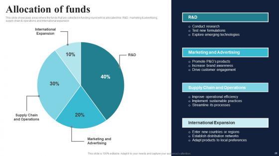 This slide showcases areas where the funds that are collected in funding round will be allocated like- R and D, marketing and advertising, supply chain and operations and international expansion. The best PPT templates are a great way to save time, energy, and resources. Slidegeeks have 100 percent editable powerpoint slides making them incredibly versatile. With these quality presentation templates, you can create a captivating and memorable presentation by combining visually appealing slides and effectively communicating your message. Download Allocation Of Funds Healthcare Product Company Fund Raising Pitch Deck Graphics Pdf from Slidegeeks and deliver a wonderful presentation. This slide showcases areas where the funds that are collected in funding round will be allocated like- R and D, marketing and advertising, supply chain and operations and international expansion.