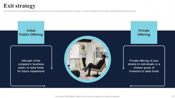 The slide provides most profitable feasible ways for investors to exit from their investment in the company. It consists of strategies like IPO Initial Public Offering and private offering. This Exit Strategy Healthcare Product Company Fund Raising Pitch Deck Sample Pdf from Slidegeeks makes it easy to present information on your topic with precision. It provides customization options, so you can make changes to the colors, design, graphics, or any other component to create a unique layout. It is also available for immediate download, so you can begin using it right away. Slidegeeks has done good research to ensure that you have everything you need to make your presentation stand out. Make a name out there for a brilliant performance. The slide provides most profitable feasible ways for investors to exit from their investment in the company. It consists of strategies like IPO Initial Public Offering and private offering.
