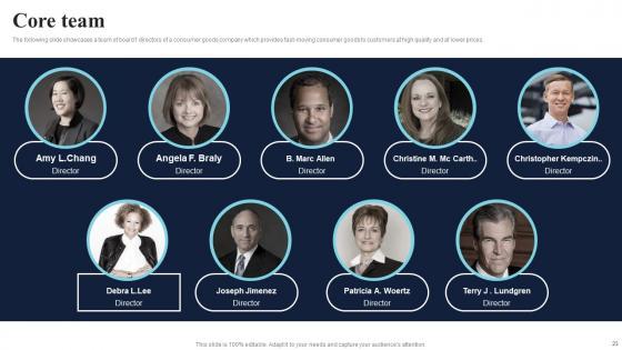 The following slide showcases a team of board f directors of a consumer goods company which provides fast-moving consumer goods to customers at high quality and at lower prices. Presenting this PowerPoint presentation, titled Core Team Healthcare Product Company Fund Raising Pitch Deck Download Pdf, with topics curated by our researchers after extensive research. This editable presentation is available for immediate download and provides attractive features when used. Download now and captivate your audience. Presenting this Core Team Healthcare Product Company Fund Raising Pitch Deck Download Pdf. Our researchers have carefully researched and created these slides with all aspects taken into consideration. This is a completely customizable Core Team Healthcare Product Company Fund Raising Pitch Deck Download Pdf that is available for immediate downloading. Download now and make an impact on your audience. Highlight the attractive features available with our PPTs. The following slide showcases a team of board f directors of a consumer goods company which provides fast-moving consumer goods to customers at high quality and at lower prices.