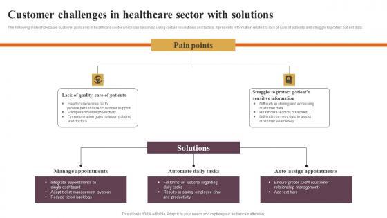 The following slide showcases customer problems in healthcare sector which can be solved using certain resolutions and tactics. It presents information related to lack of care of patients and struggle to protect patient data. Showcasing this set of slides titled Customer Challenges In Healthcare Sector With Solutions Brochure Pdf The topics addressed in these templates are Manage Appointments, Automate Daily Tasks, Auto Assign Appointments All the content presented in this PPT design is completely editable. Download it and make adjustments in color, background, font etc. as per your unique business setting. The following slide showcases customer problems in healthcare sector which can be solved using certain resolutions and tactics. It presents information related to lack of care of patients and struggle to protect patient data.