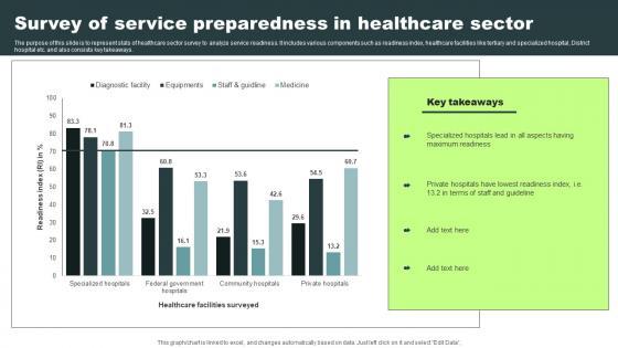 The purpose of this slide is to represent stats of healthcare sector survey to analyze service readiness. It includes various components such as readiness index, healthcare facilities like tertiary and specialized hospital, District hospital etc. and also consists key takeaways. Pitch your topic with ease and precision using this Survey Of Service Preparedness In Healthcare Sector Download Pdf. This layout presents information on Specialized Hospitals, Maximum Readiness, Staff And Guideline. It is also available for immediate download and adjustment. So, changes can be made in the color, design, graphics or any other component to create a unique layout. The purpose of this slide is to represent stats of healthcare sector survey to analyze service readiness. It includes various components such as readiness index, healthcare facilities like tertiary and specialized hospital, District hospital etc. and also consists key takeaways.
