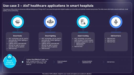 The purpose of this slide is to showcase Artificial Intelligence of Things AIoT use cases through which digital hospitals can streamline and optimize medical care process. The slide covers information about smart beds, smart lighting, and asset tracking. Here you can discover an assortment of the finest PowerPoint and Google Slides templates. With these templates, you can create presentations for a variety of purposes while simultaneously providing your audience with an eye-catching visual experience. Download Use Case 3 AIOT Healthcare Applications In Smart Hospitals AIOT Applications For Various Industries IoT SS V to deliver an impeccable presentation. These templates will make your job of preparing presentations much quicker, yet still, maintain a high level of quality. Slidegeeks has experienced researchers who prepare these templates and write high-quality content for you. Later on, you can personalize the content by editing the Use Case 3 AIOT Healthcare Applications In Smart Hospitals AIOT Applications For Various Industries IoT SS V. The purpose of this slide is to showcase Artificial Intelligence of Things AIoT use cases through which digital hospitals can streamline and optimize medical care process. The slide covers information about smart beds, smart lighting, and asset tracking.