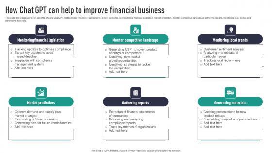 This slide showcases different benefits of using ChatGPT that can help financial organizations. Its key elements are monitoring financial legislation, market prediction, monitor competitive landscape, gathering reports, monitoring local trends and generating materials. Take your projects to the next level with our ultimate collection of How Chat GPT Can Help To Improve Financial Business Download Pdf. Slidegeeks has designed a range of layouts that are perfect for representing task or activity duration, keeping track of all your deadlines at a glance. Tailor these designs to your exact needs and give them a truly corporate look with your own brand colors they will make your projects stand out from the rest This slide showcases different benefits of using ChatGPT that can help financial organizations. Its key elements are monitoring financial legislation, market prediction, monitor competitive landscape, gathering reports, monitoring local trends and generating materials.